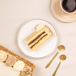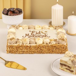 Découvrez notre généreux gâteau Léonardo au décor de fête pour l'Aïd . Célébrez en famille ou entre amis cette fête avec ce magnifique moka composé d'une génoise nature moelleuse garnie d'une crème aux noisettes, enrichie d'un praliné et d'un croustillant chocolat au lait pour une texture irrésistible.