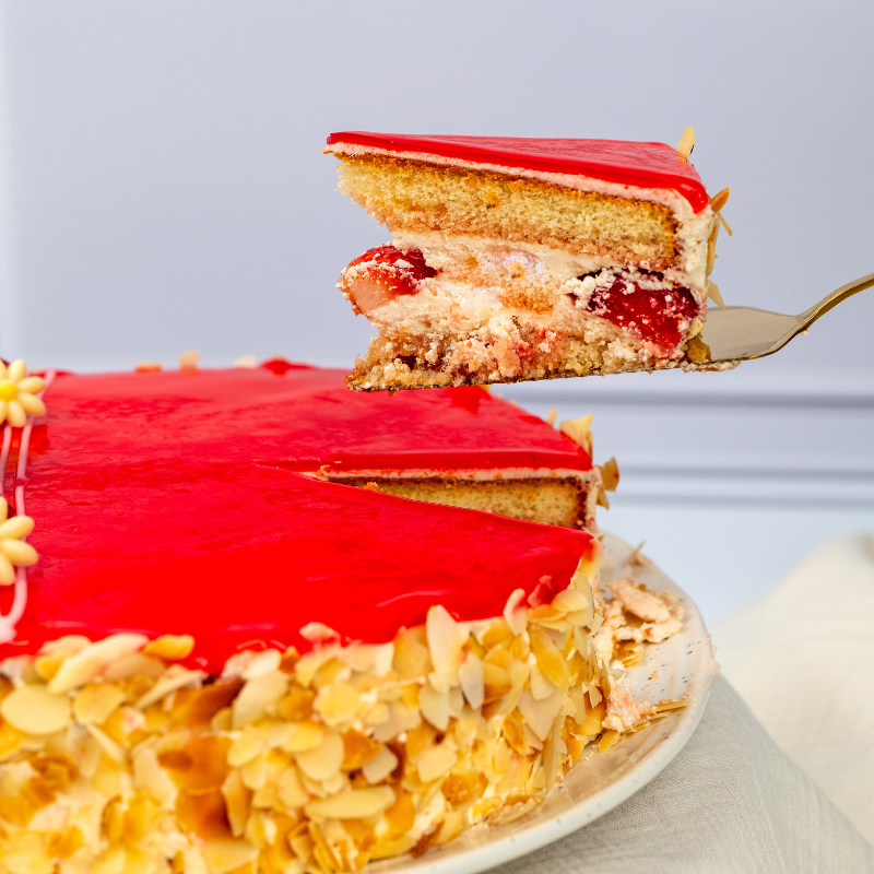 Une crème fraisier onctueuse, une génoise nature savoureuse, de véritables morceaux de fraises fraîches, et de jolies amandes effilées pour un dessert gourmand.Un anniversaire ? Une fête ?